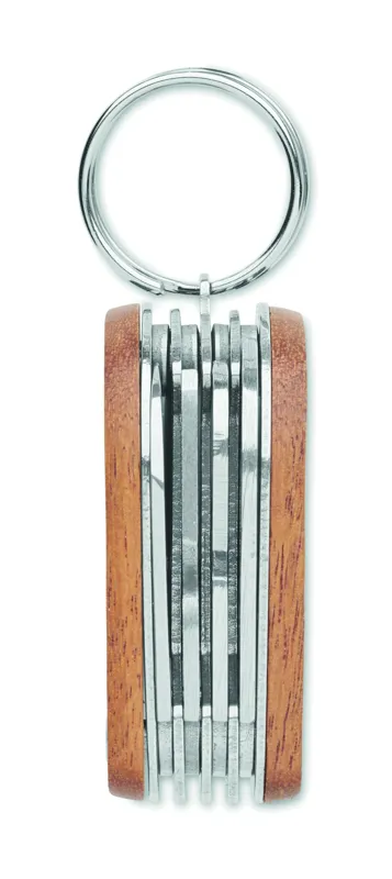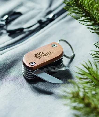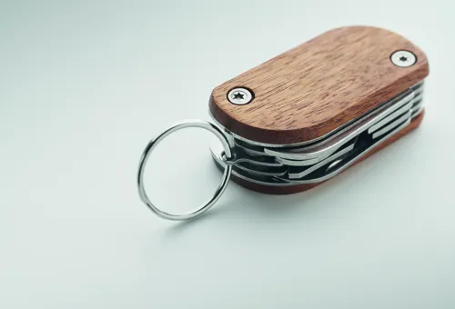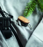 Rozsdamentes acélból készült multifunkciós zsebkés akáciafa markolattal. 7 funkció: üvegnyitó, kés, konzervnyitó, reszelő, csavarhúzó bitek, kulcstartó és 1 LED lámpa. A lámpa működéséhez szükséges 3 gombelemmel szállítjuk.