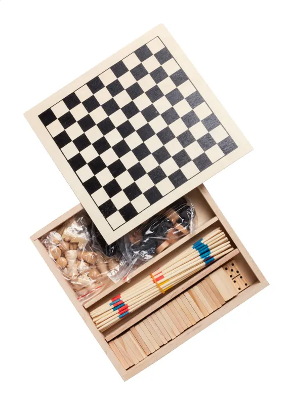 Fa játék szett, amely sakkot, dominót, marokkót és dámajátékot tartalmaz.