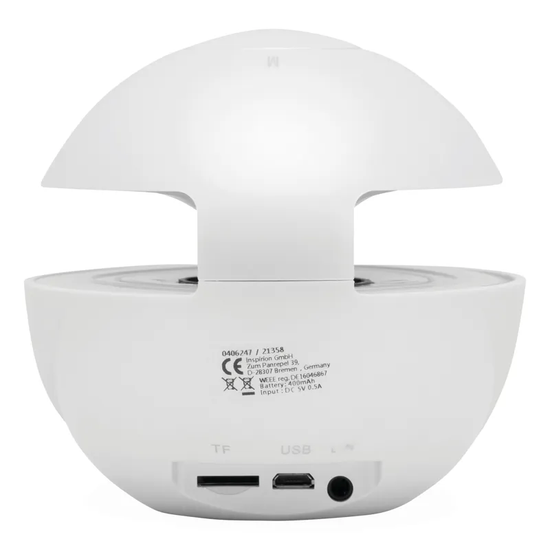 WONDER BALL MINI vezeték nélküli hangszóró: színváltó fény lejátszás közben, kimenő max. zenei teljesítmény: 3 Watt, vezeték nélküli funkcióval rendelkező eszközökhöz, hatótávolság: kb. 10 m, a 3.5 mm-es jack audio kábellel egyéb, arra alkalmas eszközökkel is csatlakoztatható (kábel hossza: kb. 53 cm), microSD kártya foglalattal, kihangosító funkcióval, frekvencia tartomány: 20 Hz - 20 KHz, újratölthető akkumulátor kb. 400 mAh kapacitással, üzemidő egy töltéssel kb. 4 óra, USB töltőkábel Micro-USB véggel (hossza: kb. 53 cm), töltési idő: kb. 4 óra, érintésvezérléssel a tetején, ki/be kapcsolóval, csúszásmentes bevonattal a talpán