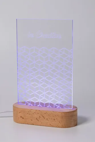 Egyedi gyártású akril trófea fa alapon, USB tápellátású többszínű LED lámpával. Egyedi formában, gravírozott grafikával. USB töltőkábellel. Az ár tartalmazza a gravírozást. Minimális rendelési mennyiség: 25 db.