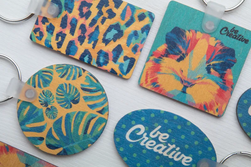 Téglalap alakú, rétegelt nyírfából készült kulcstartó, full colour nyomtatással. Az ár tartalmazza az UV LED emblémázás költségét egy oldalon. Minimális rendelési mennyiség: 200 db.