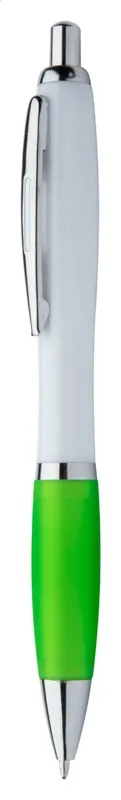 Műanyag golyóstoll fehér testtel, színes markolattal, fényes króm részekkel. Kék tollbetéttel szállítjuk.