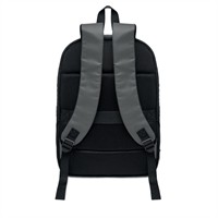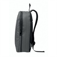Bővíthető, 600D RPET poliészterből készült 16 colos laptop hátizsák PU bevonattal az elején, RPET poliészter béléssel. Rejtett cipzáras zseb és párnázott laptop rekesz, elülső rekesz, hálós hátoldal és gurulós bőröndre illeszkedő pánt.