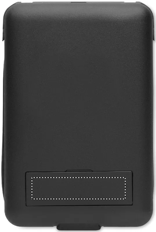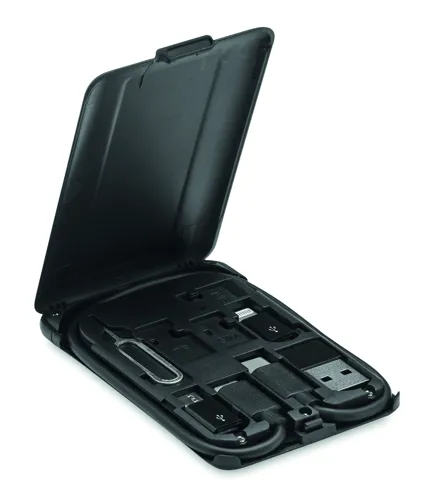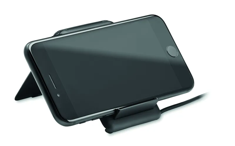 Kompakt kábel tároló kártya 15 W vezeték nélküli töltővel és telefonállvány funkcióval. C-C-kábel átalakítókkal. SIM kártya kiszedő tű és hely 2 Nano Sim és 1 mikro SD kártya számára.