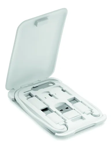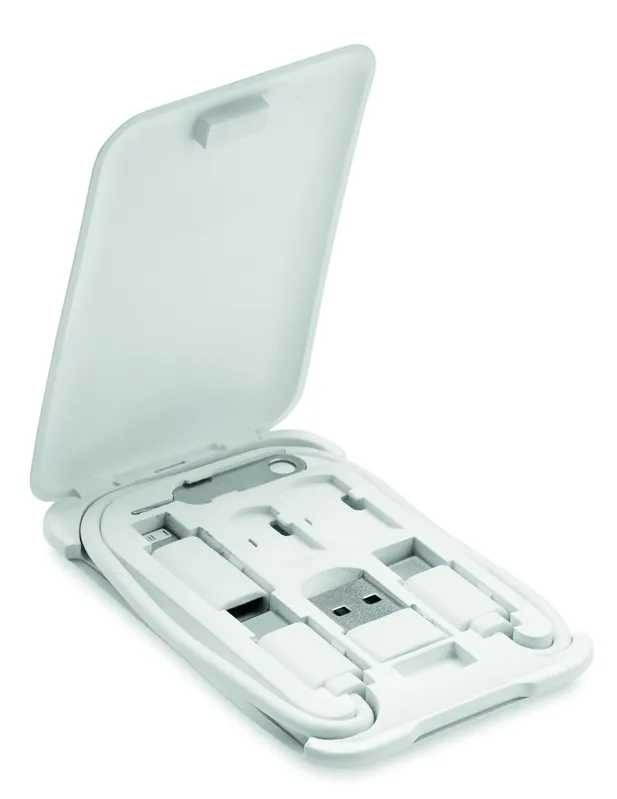 Többfunkciós kábelkészlet. Adatátviteli és töltőkábeleket tartalmaz: C-C kábel adapterekkel. SIM kártya kiszedő tű. Nano és Micro SIM tárolóhely. Mágnesesen záródó doboz telefonállvány funkcióval.
