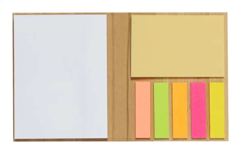 Bambusz borítású jegyzettömb 70 lappal, 25 öntapadós jegyzetlappal és 125 oldaljelölővel (5 féle színben).