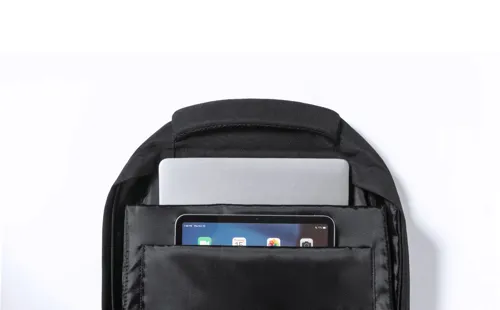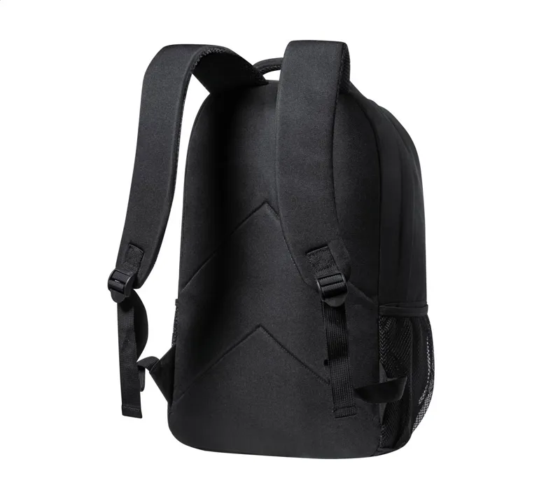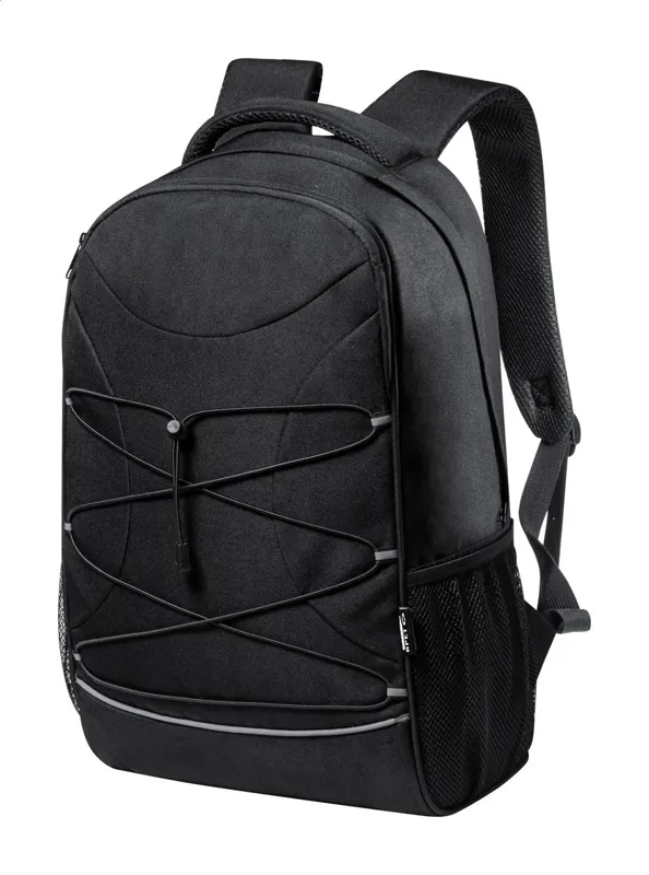 RPET hátizsák cipzáras rekeszekkel, hálós oldalzsebekkel és rugalmas zsinórral. Párnázott laptop (15") és tablet (12") tartókkal, vállpánttal és hátsó résszel. Megkülönböztető RPET címkével ellátva, 600D RPET poliészter.