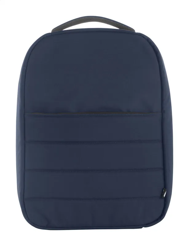 Teljesen párnázott RPET hátizsák cipzáras rekeszekkel, párnázott laptop (15") és tablet (12") rekesszel, pánttal bőröndre rögzítéshez, ergonomikus hát- és vállpánttal. Rejtett lopásgátló zsebbel. 300D RPET poliészter. Megkülönböztető RPET címkével.