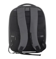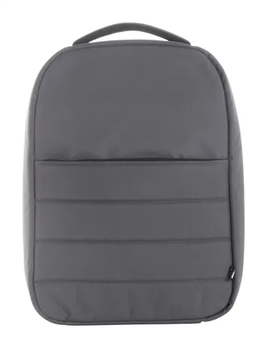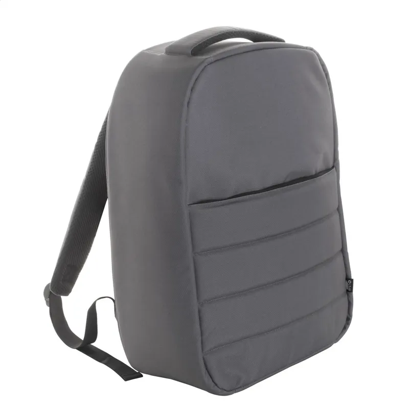Teljesen párnázott RPET hátizsák cipzáras rekeszekkel, párnázott laptop (15") és tablet (12") rekesszel, pánttal bőröndre rögzítéshez, ergonomikus hát- és vállpánttal. Rejtett lopásgátló zsebbel. 300D RPET poliészter. Megkülönböztető RPET címkével.