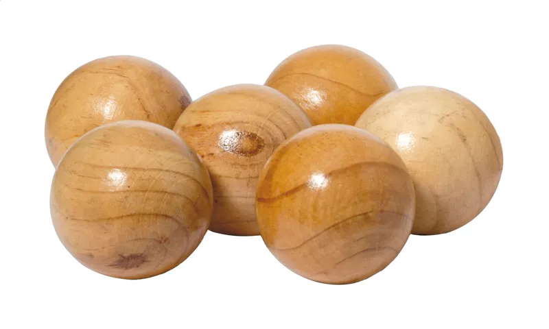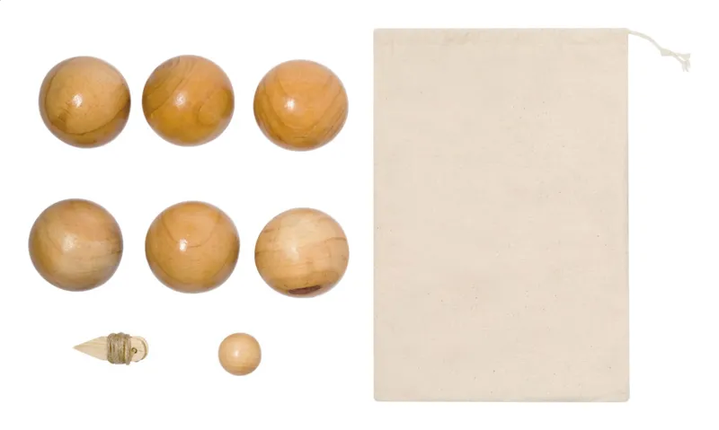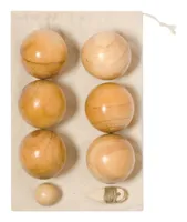 Fából készült petanque játék 6 golyóval, pamut zsinóros tasakban.