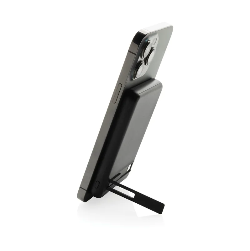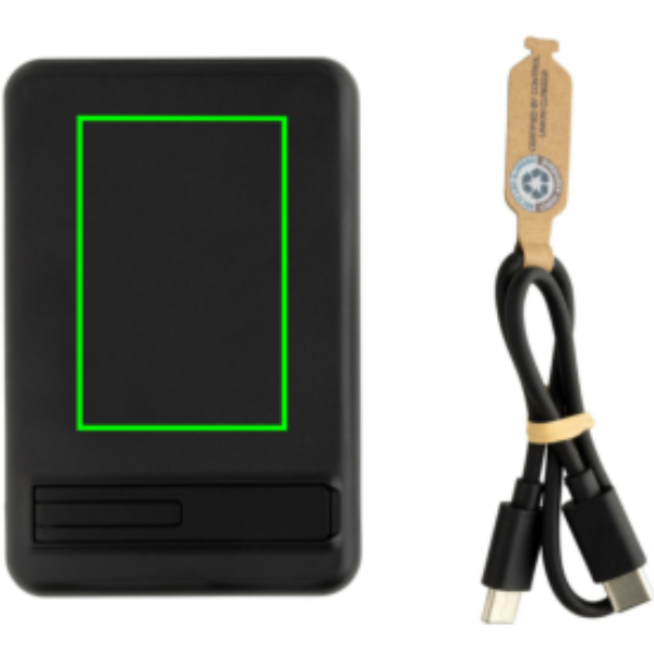 5000 mAh-s zsebméretű powerbank 5 W-os mágneses vezeték nélküli töltővel, RCS újrahasznosított ABS műanyagból és FSC bambuszból készült tokkal.. Az RCS-tanúsítvány biztosítja az újrahasznosított anyagok ellátási láncát. Teljes újrahasznosított anyagtartalom: 22% a termék összsúlya alapján. Hosszú élettartamú, A-fokozatú, 5000 mAh-s lítium-polimer akkumulátort tartalmaz. Integrált telefonállvánnyal. A teljesítményjelzők jelzik a fennmaradó energiaszintet. C típusú bemenet 5 V/2,4 A; C típusú kimenet: 5 V/2 A. 4 A A termék és tartozékai PVC-mentesek. RCS újrahasznosított TPE töltőkábellel. FSC® mix csomagolásban.