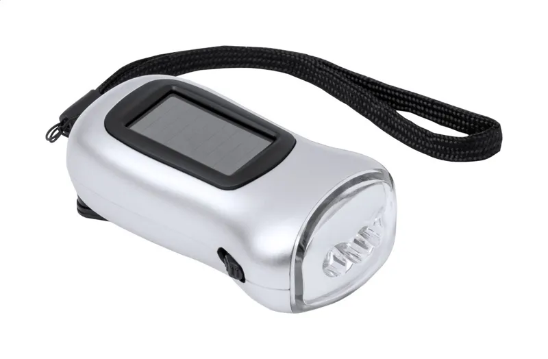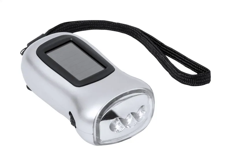 3 LED-es, kettős töltésű elemlámpa napelemes és kézi dinamó töltővel. ABS műanyag házban, hordszíjjal.