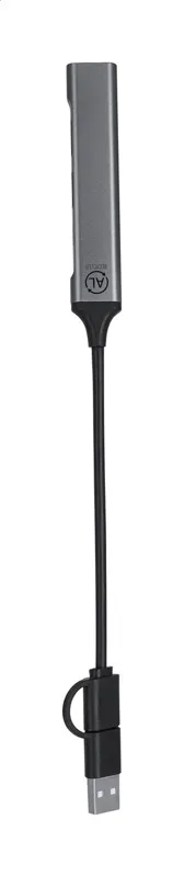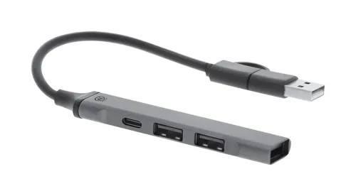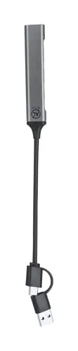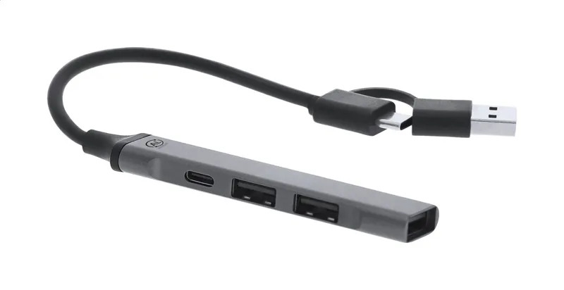 Újrahasznosított alumínium USB hub 3 USB (USB 2.0) és 1 USB-C (USB 3.0) porttal. USB és USB-C csatlakozós kábellel szállítjuk.