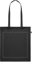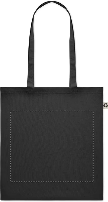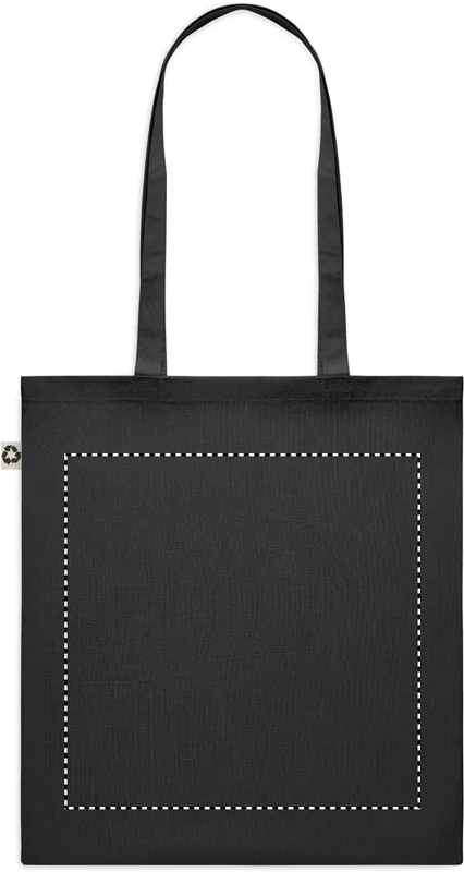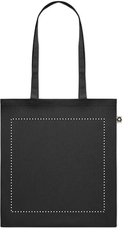 Fogyasztás utáni újrahasznosításból készült pamut bevásárlótáska hosszú fülekkel. 65% újrahasznosított pamut, 35% hagyományos pamut, 140 g vastag anyag.