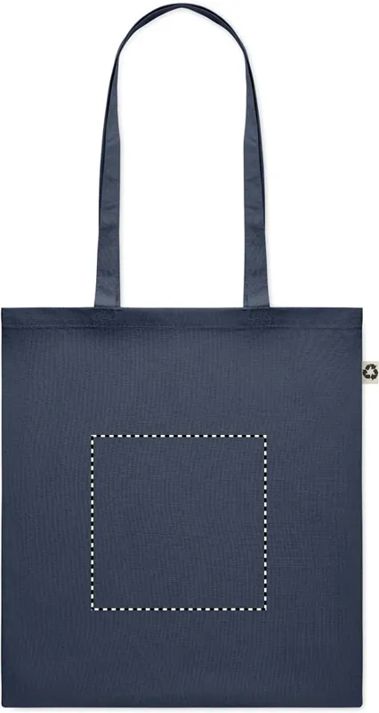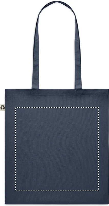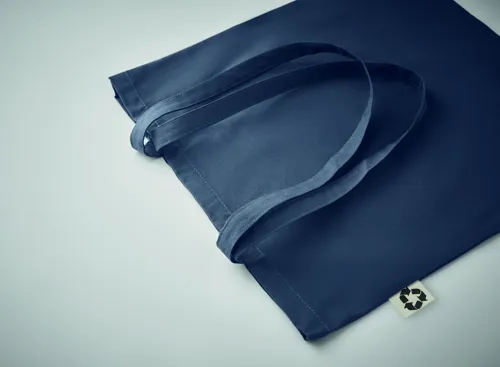 Fogyasztás utáni újrahasznosításból készült pamut bevásárlótáska hosszú fülekkel. 65% újrahasznosított pamut, 35% hagyományos pamut, 140 g vastag anyag.