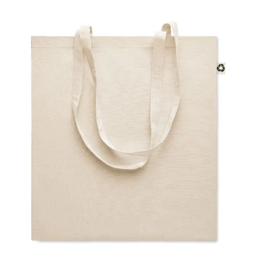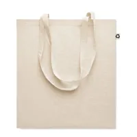 Fogyasztás utáni újrahasznosításból készült pamut bevásárlótáska hosszú fülekkel. 65% újrahasznosított pamut, 35% hagyományos pamut, 140 g vastag anyag.